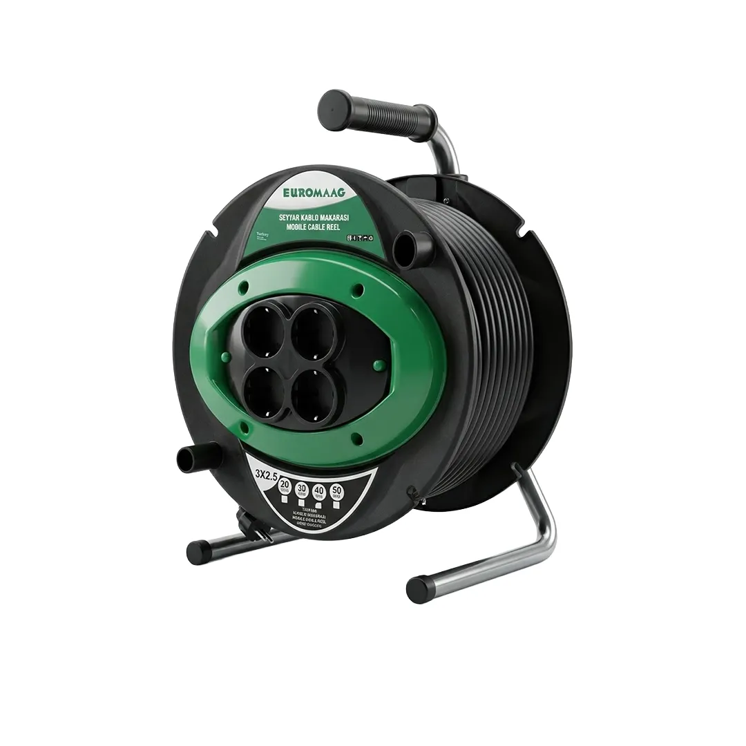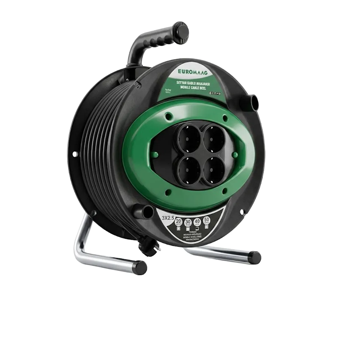 EUROMAAG seyyar kablo makarası, yüksek akım çeken profesyonel el aletlerini şantiye veya atölye ortamında güvenle çalıştırmak için tasarlanmıştır. 3x1.5 mm² kablo kesiti sayesinde 3000 Watt'a kadar olan yükleri ısınma sorunu yaşamadan taşıyabilir.