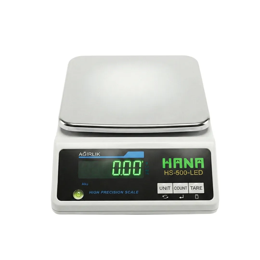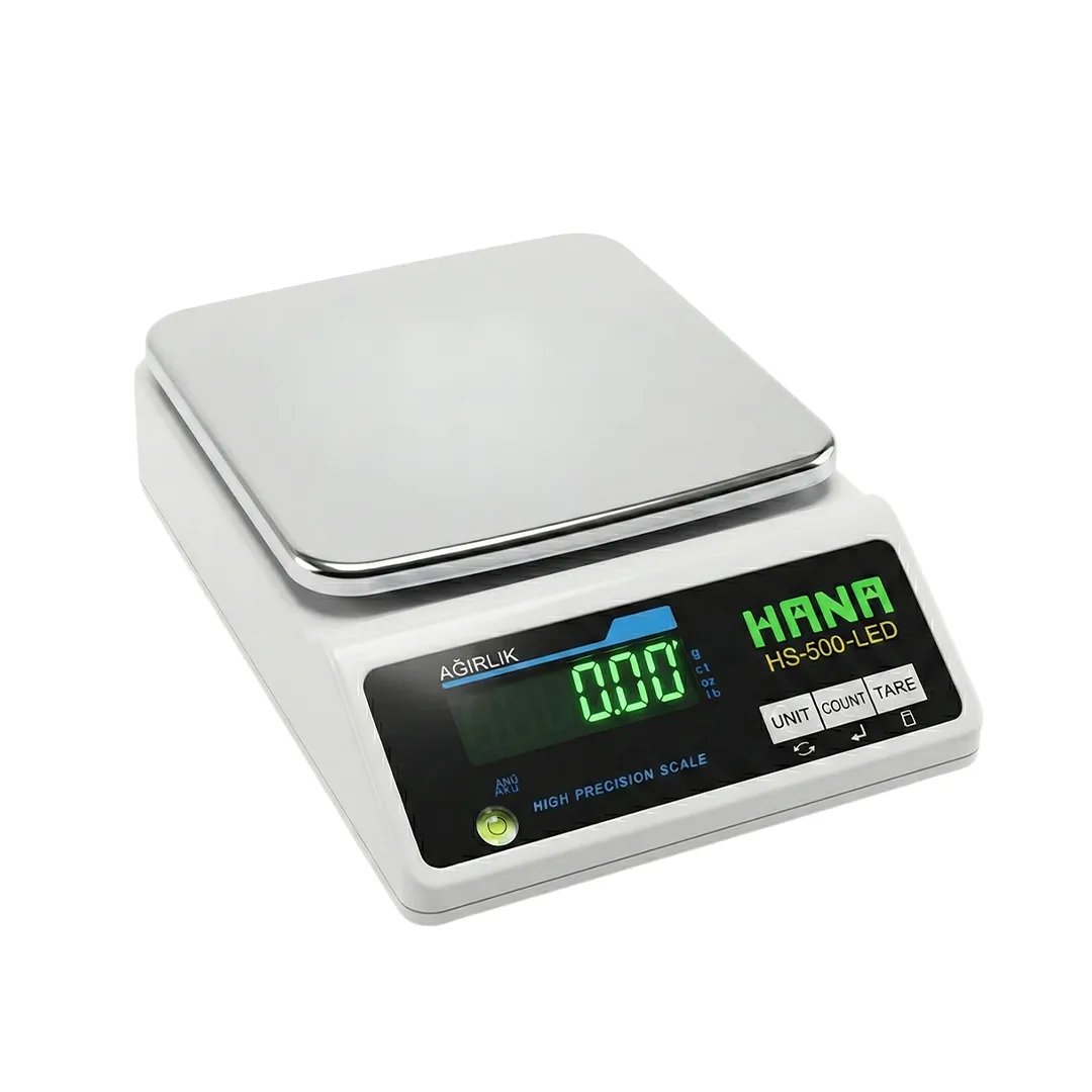 Hana HS-500 LED, 3000 gram kapasitesi ve 0.01 gram gibi ultra hassas tartım yeteneği ile laboratuvarlar, kuyumcular, eczaneler ve endüstriyel boya karışımları için idealdir. "High Precision Scale" (Yüksek Hassasiyetli Terazi) sınıfında yer alan bu cihaz, en küçük ağırlık değişimlerini bile anında algılar.