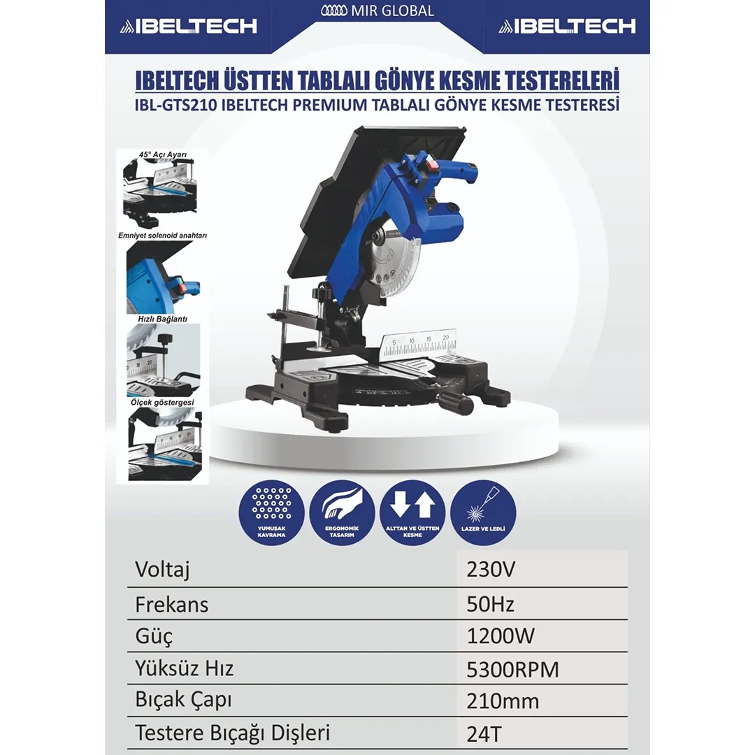 Ibeltech IBL-GTS210 Premium Tablalı Gönye Kesme Testeresi - 1200W, Lazer ve LED Işıklı