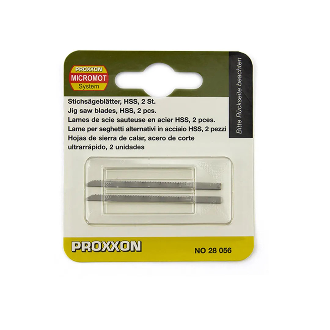 Proxxon 28056, MICROMOT serisi dekupaj testereleri için bir yedek Testere Bıçağı Setidir. Özellikle SS 230/E ve STS 12/E kullanıcılarının metal ve sert plastik kesme operasyonlarında ihtiyaç duyduğu yüksek aşınma direncini karşılamak üzere HSS (Yüksek Hız Çeliği) materyalden imal edilmiştir.
