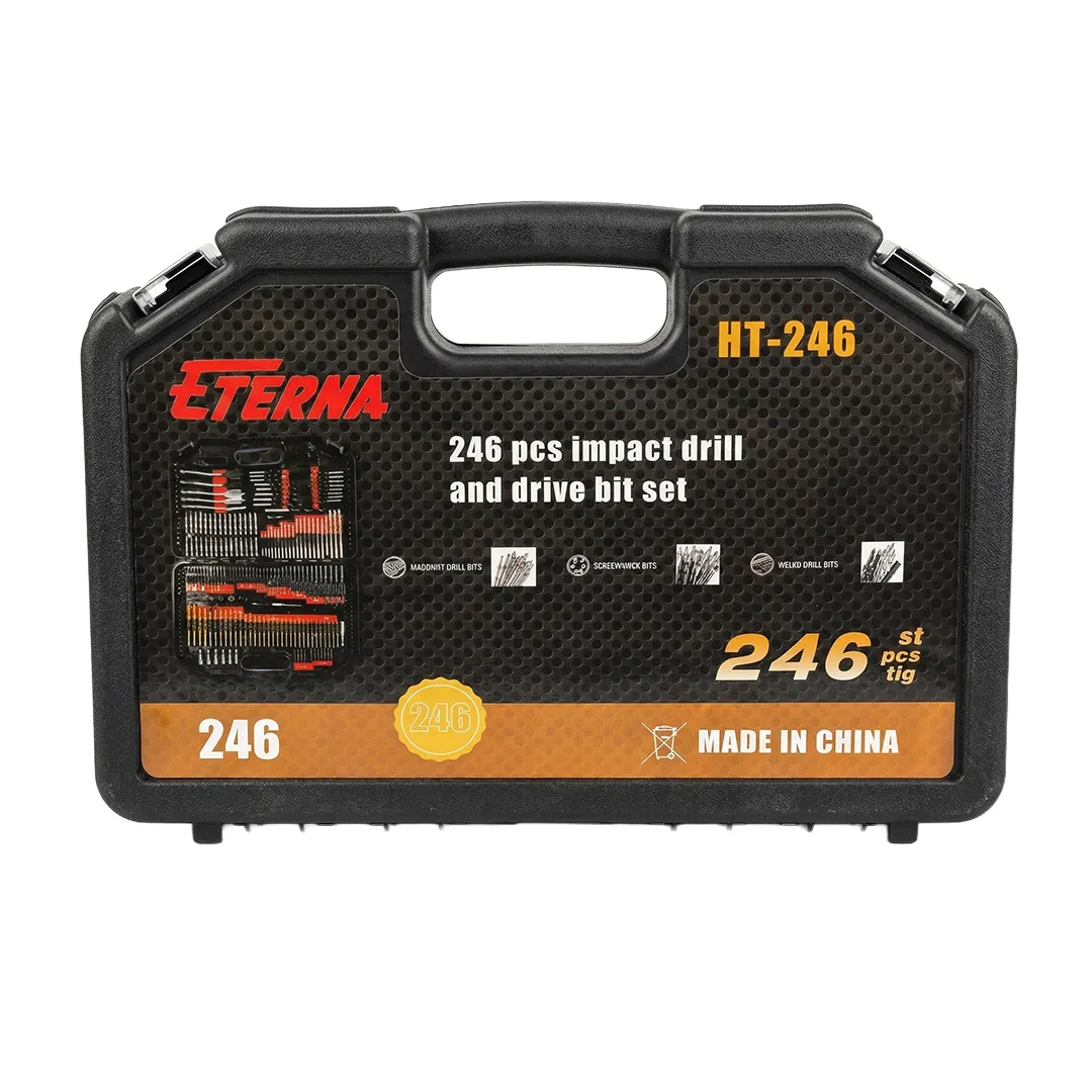Eterna HT 246 modeli ev atölye ve profesyonel işleriniz için gereken tüm delme ve vidalama aksesuarlarını tek bir çantada toplar. 246 parçalık dev içeriği ile metal ahşap beton ve duvar delme işlemlerinde tam çözüm sunar. Set içerisinde titanyum kaplamalı HSS metal uçlar duvar uçları ahşap uçlar ve geniş delikler için yaprak matkap uçları yer alır. Ayrıca her türlü vidalama işi için zengin bit uç seçeneği lokma takımı dairesel kesimler için panç seti havşa ucu ve derinlik stoperleri gibi yardımcı ekipmanlar da mevcuttur. Dayanıklı sert plastik çantası sayesinde tüm parçalar düzenli ve güvenli şekilde taşınabilir.
